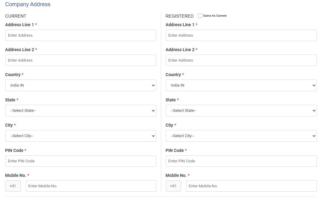 Provide your complete registered address. If your current operational address matches your registered address, you can check "Same as Current Address." Ensure the address matches exactly with your submitted documents to avoid rejection.