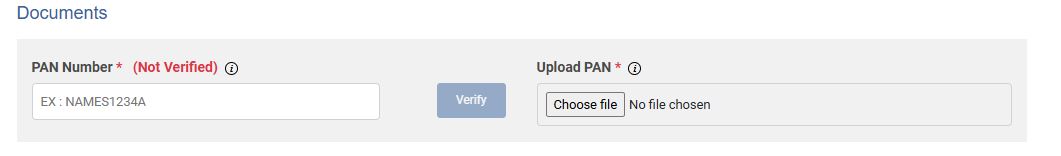 Enter your company PAN number and verify it. For sole proprietorships, use your personal PAN. After verification, upload a clear image of the PAN card (JPG or PNG format, under 100KB).