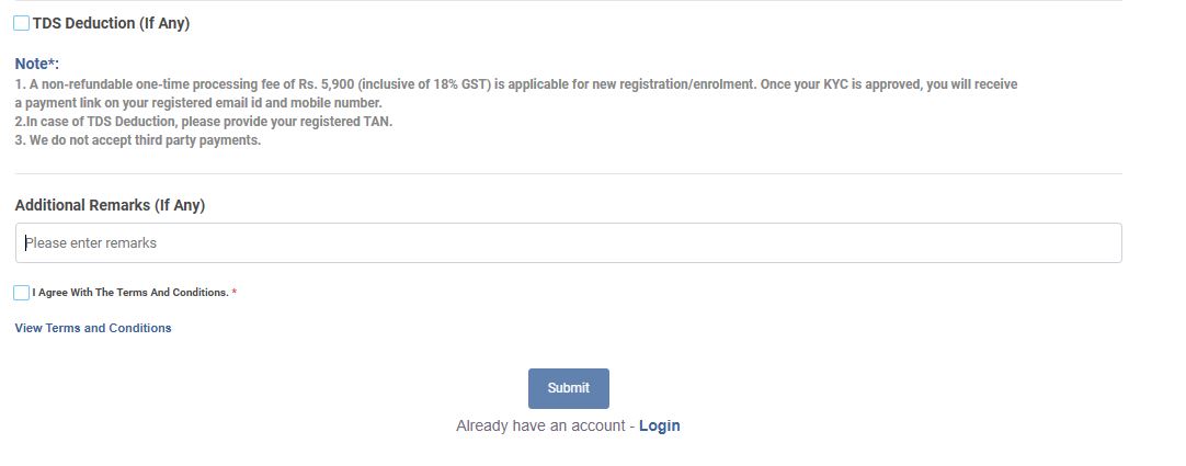 Add any relevant remarks (optional), agree to the terms and conditions, and click Submit. You'll receive a confirmation message: "Registration application submitted successfully. Please verify your email."