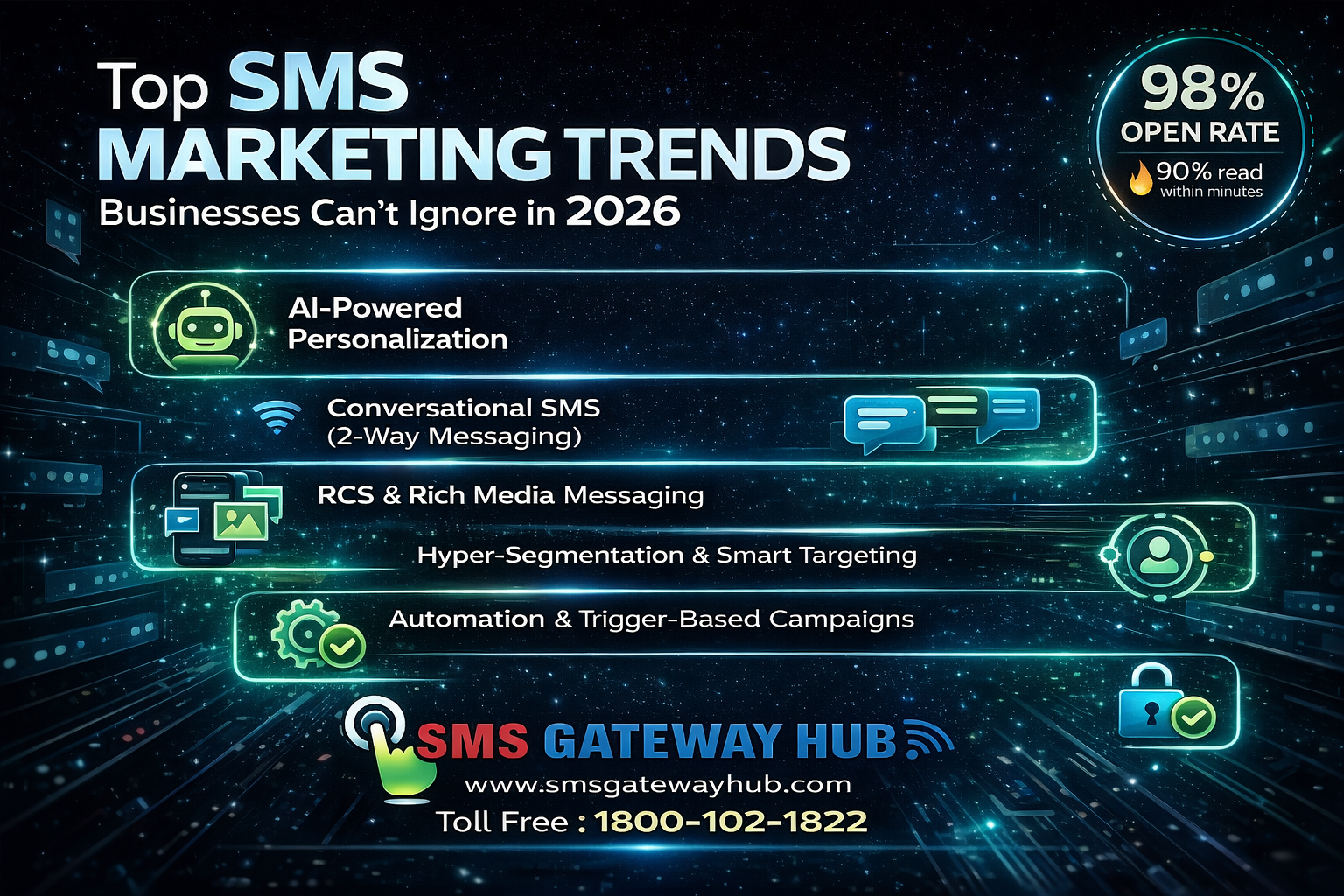 As we step into 2026, new technologies, regulations, and customer expectations are reshaping how businesses use SMS. In this SEO-friendly guide, we’ll explore the top SMS marketing trends in 2026 and how SMS GatewayHub helps businesses stay ahead of the curve.
